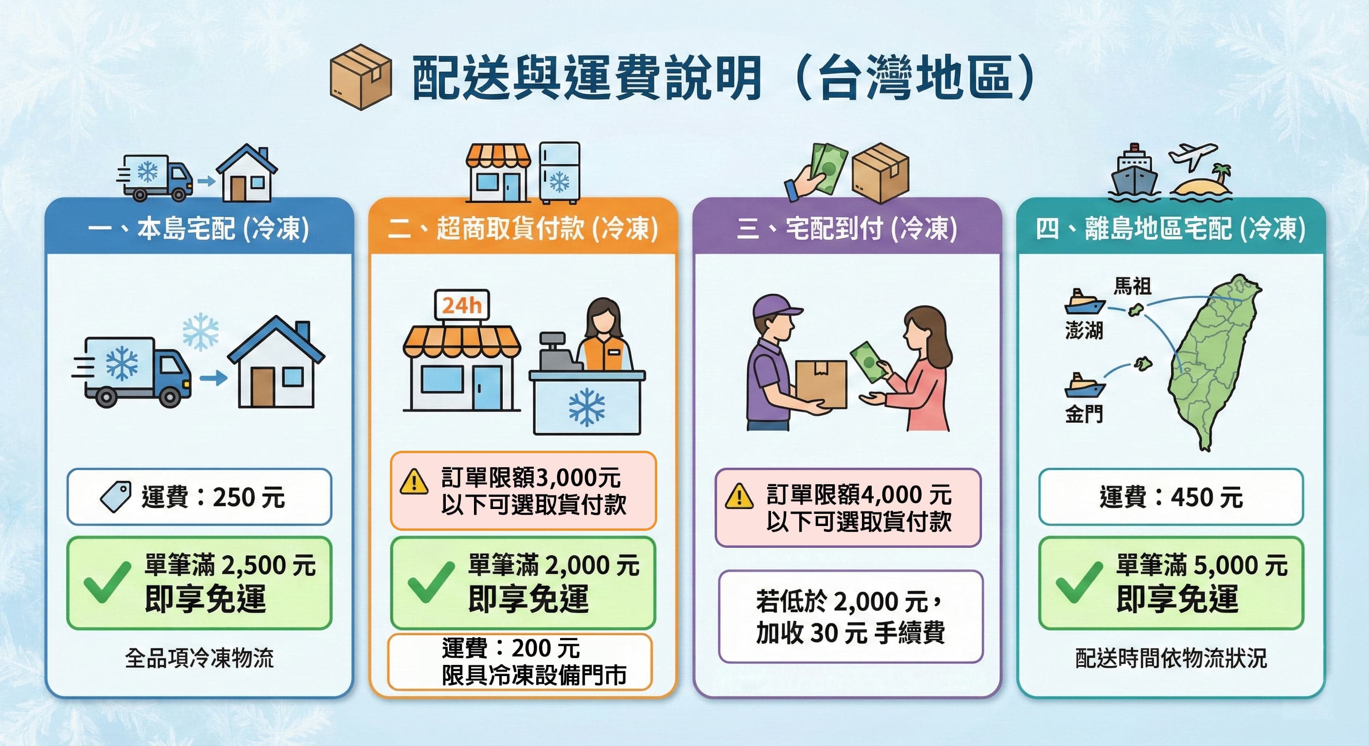 - 超商冷凍 200 元,滿 2000 元免運費。