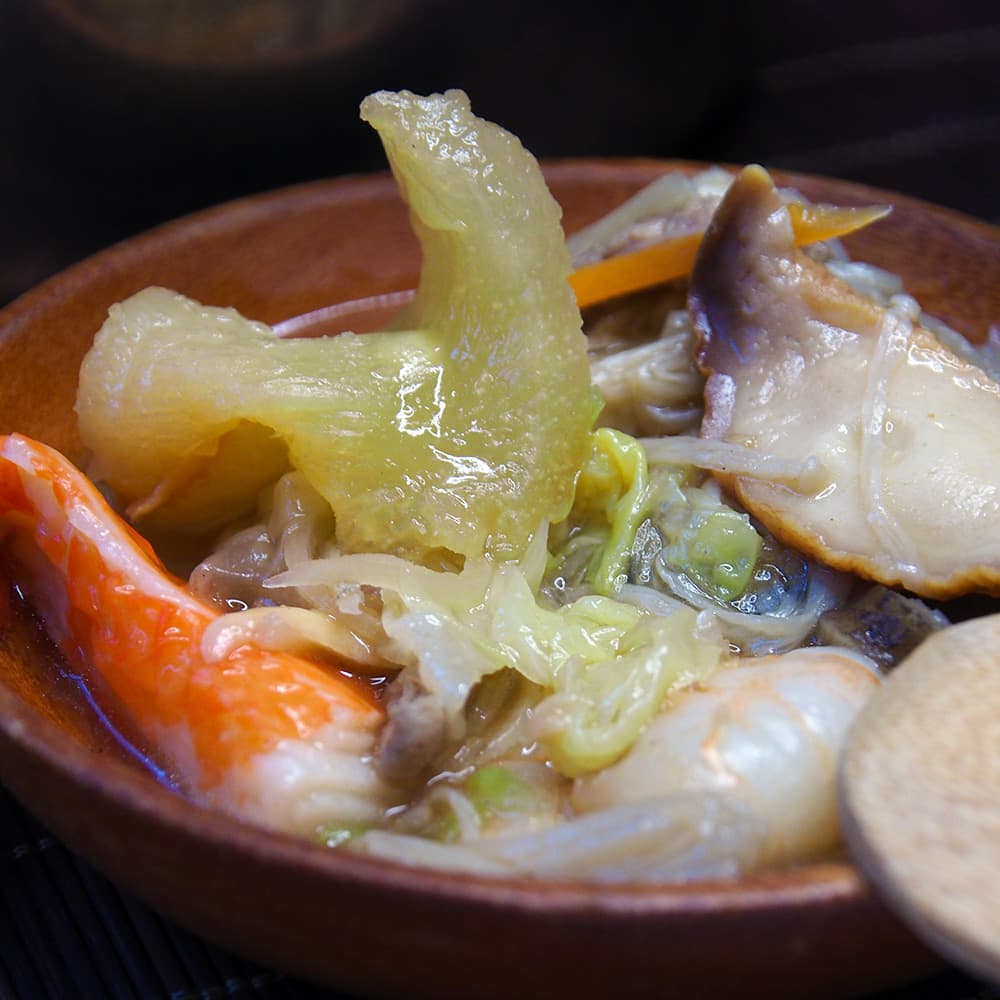 鮮潮排翅總匯羹已經勾好芡,可再依喜好調整,建議分次加入太白粉水或純水調整濃度,避免一次加太多造成粉味或結塊。