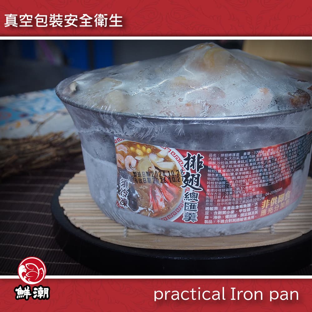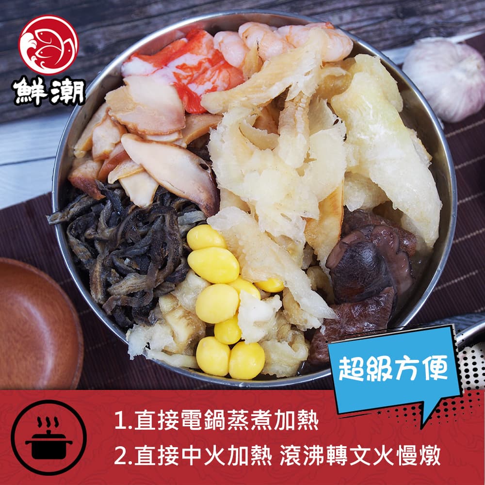 • 【成份】: 魚翅、大白菜、香菇、筍絲、蝦仁、高麗菜、豬肉、金針菇、魚皮絲、冬蝦、扁魚、蟹味棒、海參、木瓜螺、肉絲、魚肚、透抽、麻油
