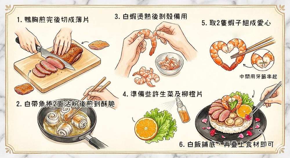 | 5.先把白飯放在底下,然後中間鋪上白帶魚捲,然後再鋪上一圈蝦子後,把鴨胸肉片鋪在最上面,然後中間放上柳橙片。 |