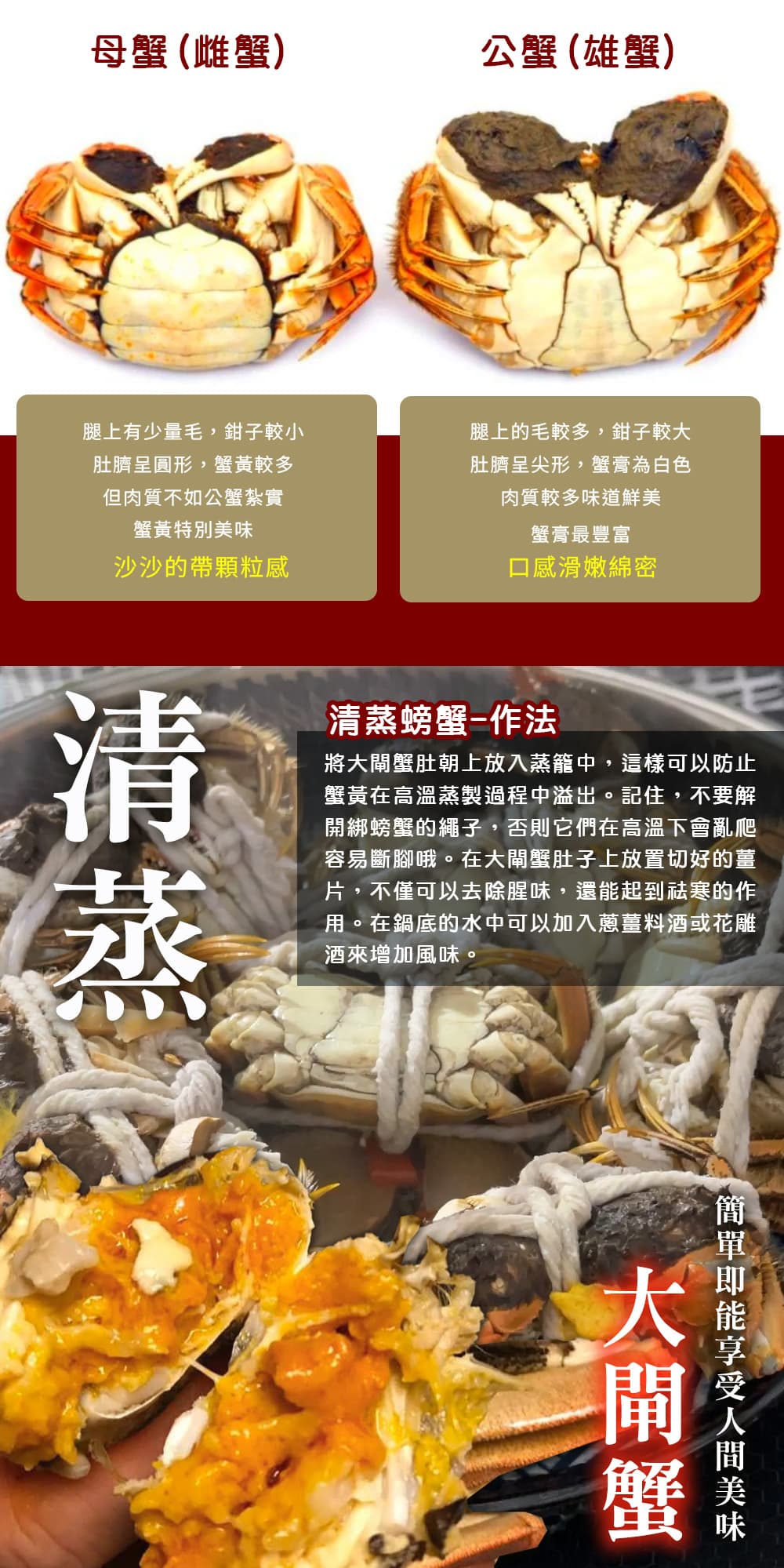 - 簡單三步,輕鬆開蒸!1. 刷洗大閘蟹身表面、關節接縫處 ➜ 2. 15-18 分鐘大火清蒸 ➜ 3. 薑醋佐料開吃!